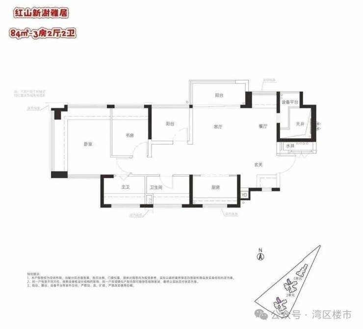 84㎡的3房2厅2卫,设计的是横厅南北通透格局,客厅3.4米开间,LDKG+X空间一体化,动静分区,主卧南北通设计,餐厅位带1个设备平台,U型厨房,卫生间干湿分离,得房率:100%(包含赠送),阳台东北朝向。