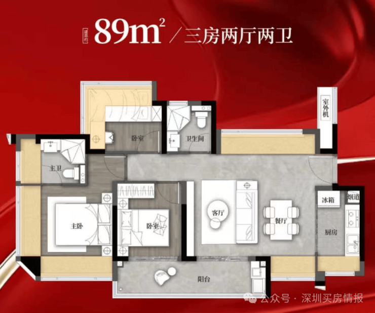 89㎡的3房2厅2卫,设计的是竖厅格局,客厅3.4米开间,LDKB一体化,S墙设计预留冰箱卡槽位,3个卧室分别做到了3.9米/2.9米/2.6米的宽度,客厅连接次卧出6.3米长的大阳台,L型厨房,卫生间干湿分离,有西北、西南或东南朝向。