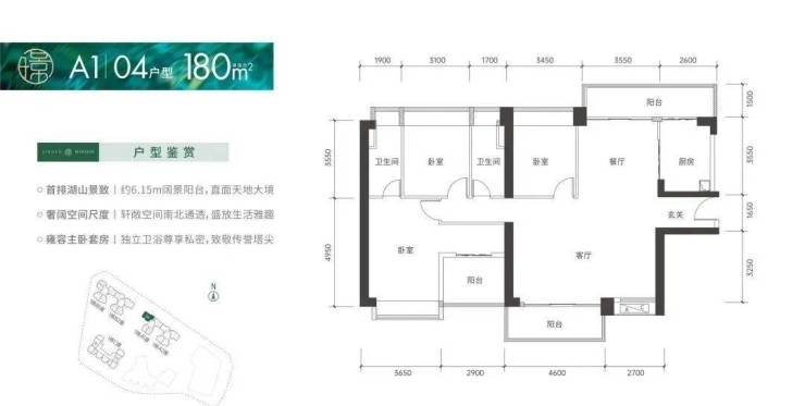 180㎡的4房2厅2卫,设计的是竖厅格局,南北通透双阳台,客厅7.3米大开间,进门入户玄关,4个卧室分别做到了3.65米/3.45米/3.1米/2.9米的宽度,U型厨房,卫生间干湿分离,得房率:75.66%(不含赠送),客厅阳台主朝西南向,餐厅位还有个长6.15米的观景大阳台。