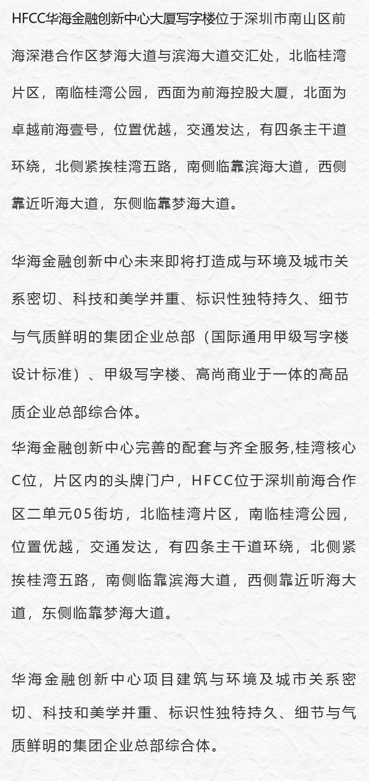 深圳华海金融创新中心位于前海核心区,总建筑面积约30万㎡,涵盖超甲级写字楼、商业及生态空间。项目以“金融+科技”为定位,打造国际化创新平台,汇聚高端资源,配备智能设施与绿色生态,助力湾区金融科技融合发展,成为前海地标性综合体。