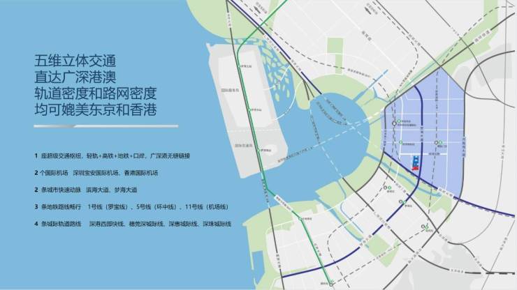 交通:地铁1号线(鲤鱼门站)步行3分钟,地铁5号线/11号线(前海湾站)步行8分钟,毗邻滨海大道与广深沿江高速,30分钟直达深圳湾口岸及福田CBD