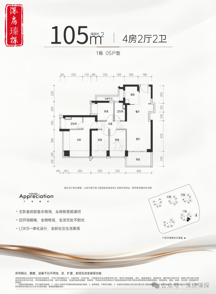 105㎡的4房2厅2卫,设计的是经典竖厅格局,进门入户玄关,客厅3.6米开间,LDKB一体化设计,动静分区,四开间朝南,S墙设计预留冰箱卡槽位,分别做到了主卧17.59㎡/次卧9.5㎡/次卧8.93㎡/次卧7.75㎡(包含墙体飘窗),U型厨房,卫生间干湿分离,公卫还带1个3.12㎡的设备平台,得房率约:100%(包含赠送),东南朝向看观澜河景观。
