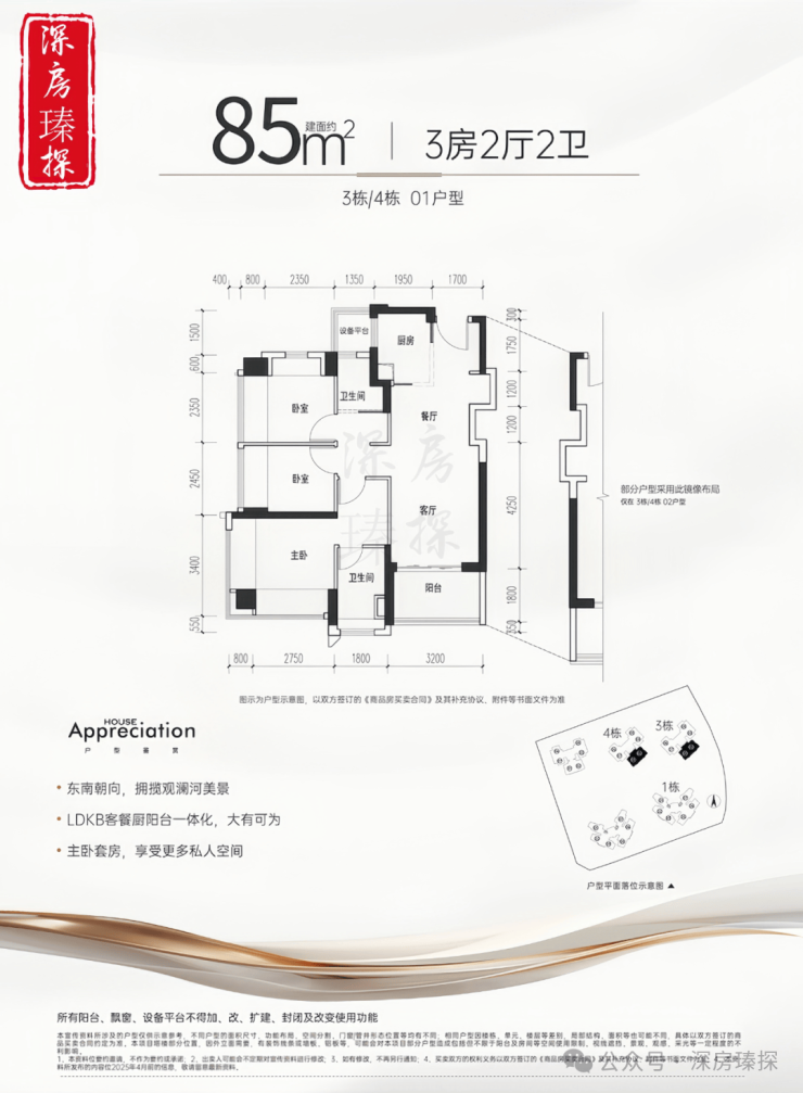 85㎡的3房2厅2卫,设计的是竖厅格局,客厅3.2米开间,LDKB一体化设计,S墙设计预留冰箱卡槽位,动静分区,三开间朝南,分别做到了主卧16.41㎡/次卧7.71㎡/次卧7.4㎡(包含墙体飘窗),U型厨房,公卫三段式分离还带2㎡的设备平台,得房率约:97%(包含赠送),东南朝向看观澜河景观。