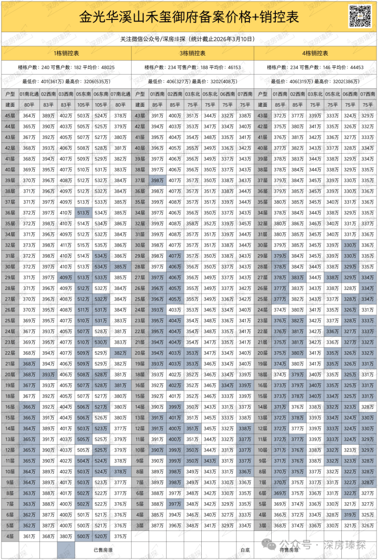 龙华观澜,金光华溪山禾玺御府于2025年5月21日取证入市,本次首推1/3/4栋,面积有75-80-83-85㎡的3房2厅2卫,105㎡的4房2厅2卫户型,共708套房源,备案均价4.62万/㎡,备案单价4.24-5.09万/㎡,总价319-535万/套,合同约定在2027年9月份带精装交房。