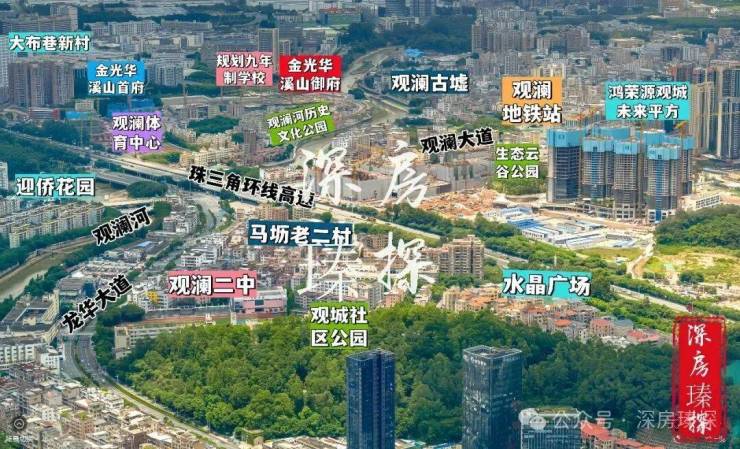 金光华溪山禾玺,位于深圳龙华区观澜街道,地处龙华区府行政中心核芯圈,占据“一圈一区三廊”发展格局的战略要地。项目紧邻九龙山数字城、鹭湖中心城及观澜文化小镇三大重点发展片区,受惠于大湾区及先行示范区政策叠加红利,是龙华未来城市更新的核心区域。周边规划涵盖行政、文化、科技等多重功能,未来将形成集产业升级与生态宜居为一体的综合性新城。目前虽存在部分城中村待改造,但多数已纳入旧改范围,区域发展潜力显著。