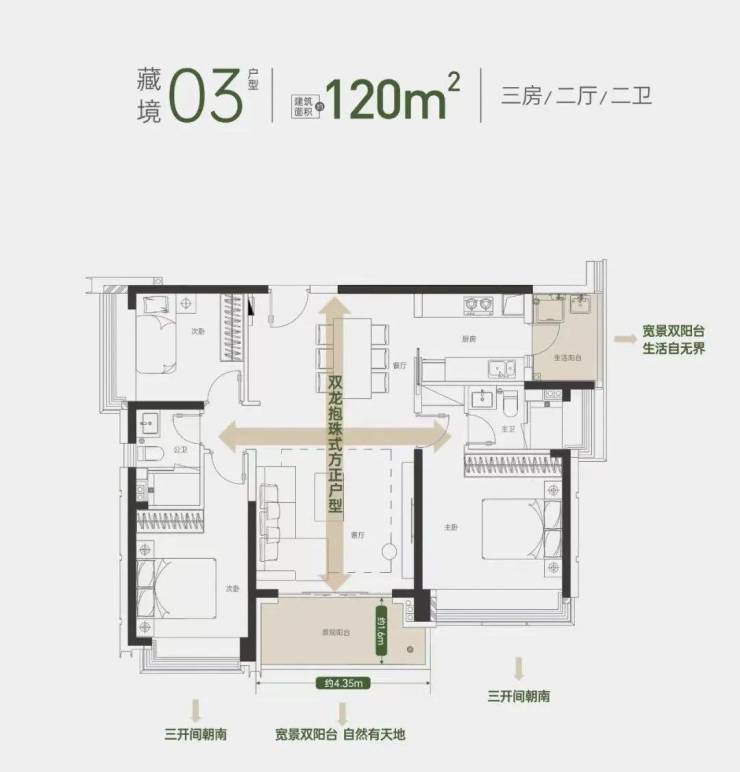 03户型 约120㎡3房2卫:双龙抱珠户型,三开间朝南,双阳台设计