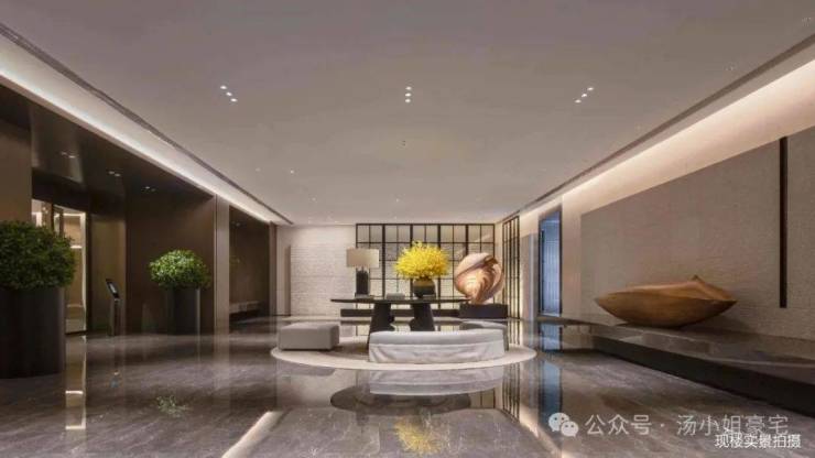 顶奢酒店式入户大堂,石材铺装,打造尊崇的三重归家礼序,开敞阔绰奢豪,点缀多元艺术美陈。