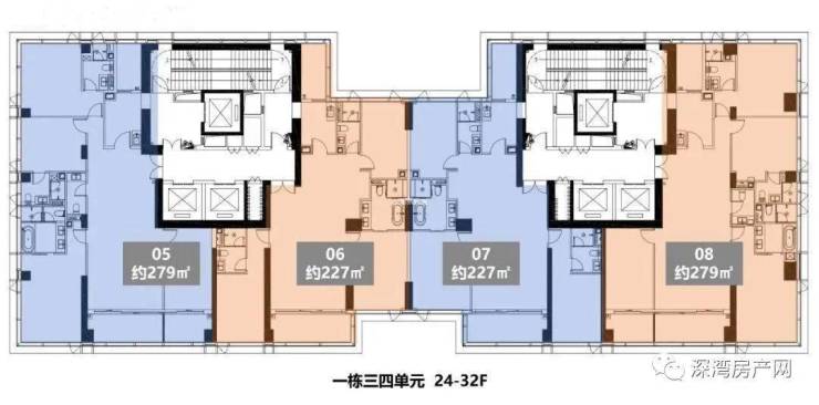 【一栋 三、四单元】(3梯2户)总高38层,23层以下为商办,23层以上为公寓,6-22层为商办。