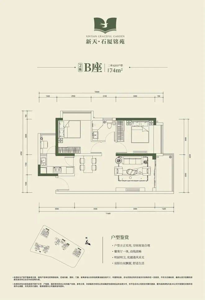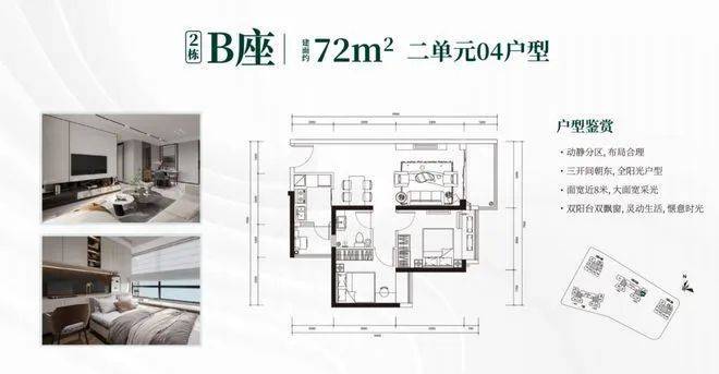 2栋B座二单元04、05户型:面积约为72-74㎡的2房2厅1卫。