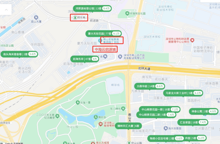 中海云启源境位于南山北环大道与南山大道交汇处西北侧,是原南山润亚奕拓厂房的旧改项目,周边有豪方天际花园和前海东岸这两个在区域二手市场上热度比较高的小区,还有一个2022年入市的次新盘尚璟公馆。