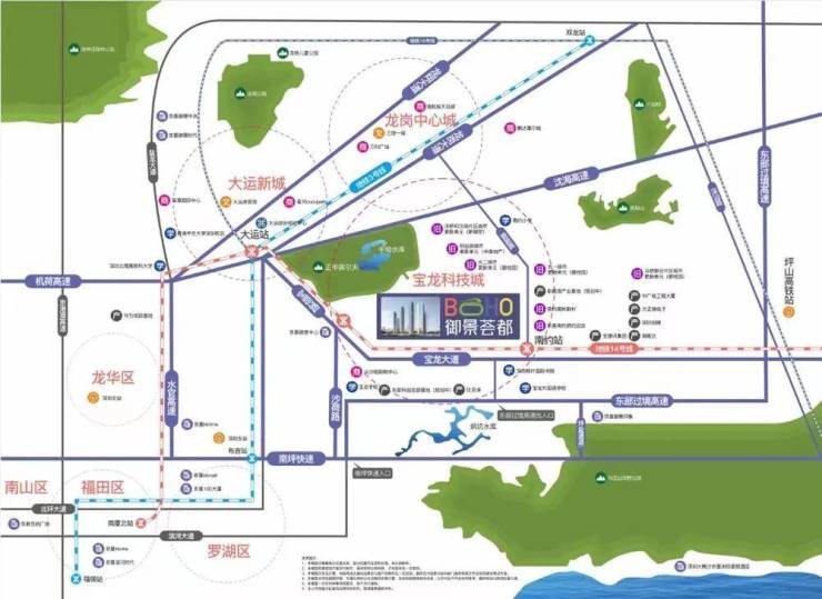 依托优越的条件,致力于打造片区集居住、购物、休闲、酒店、办公于一体的都尝生活综合体。14号快线地铁口物业 为生活加速度项目直连地铁14号线(建设中)南约地铁口(来源:龙岗区宝龙街道办事处),预计2022年下半年通车,未来可直达大运、福田中心,未来可享四地铁交汇利好;沈海高速和东部过境高速南北贯穿,直通罗湖,无缝连接福田、南山;坐享地铁、铁路交通、公交枢纽等多维交通体系,快速通达深圳中心城区、香港及周边城市,高效链接都会生活圈。