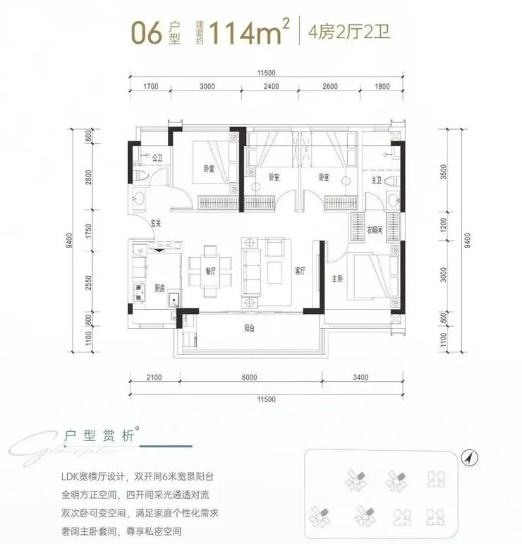 建面约114㎡是传统短进深大开间横厅格局,通透性很好,客厅进深6米,开间4.3米(不含阳台),配有6米宽景阳台,主卧套间设计,配衣帽间和三段式卫生间,这个户型很比较讨喜年轻的购房群体。