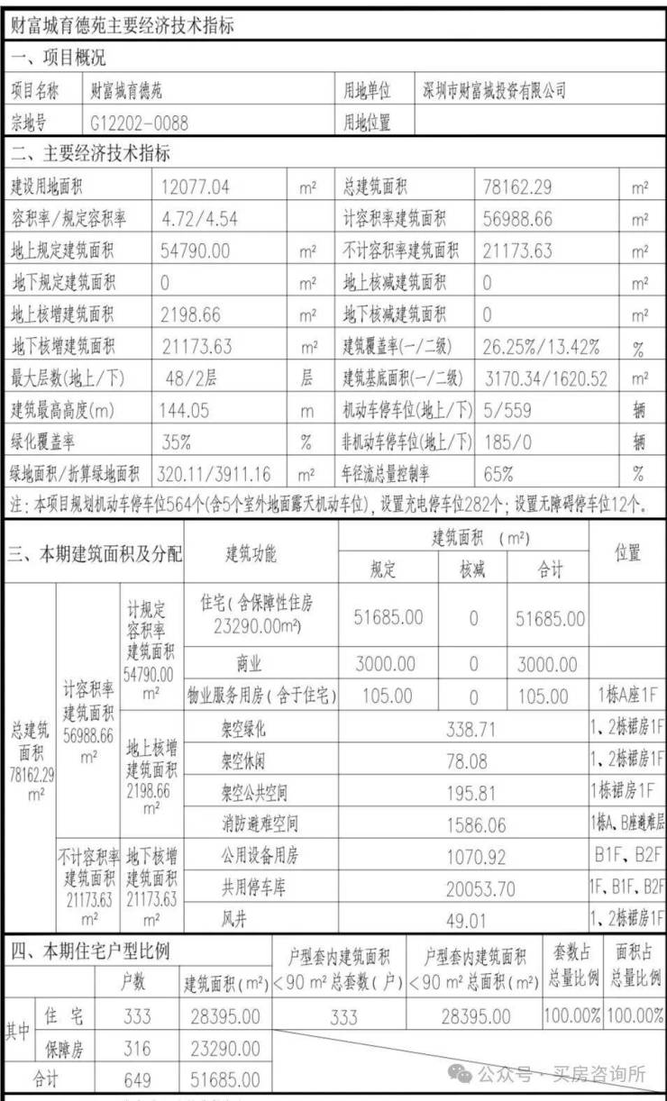 总规划649户(其中商品房333户,保障房316户),其中商品房户型套内建筑面积<90㎡的有333户,机动停车位564个,非机动停车位185个