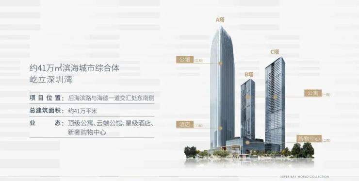 恒裕深圳湾项目总占地约2.5万㎡,总建面41万㎡,包含三栋超高层建筑(最高310米)及下沉式商业,是深圳湾片区稀缺的地标性物业。定位为集超甲级写字楼、高端公寓、都会商业于一体的滨海城市综合体。