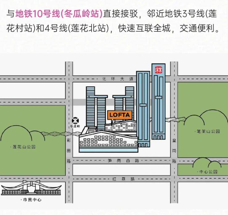 同时周边具备城际高速、高铁(福田枢纽中心)、城市快速干道、次干道、皇岗口岸、机场快线等多维交通配套。在建的地铁10号线设有地铁站与项目商业部分完美连通。