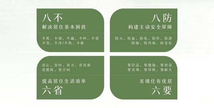 提炼推出了「八不、八防、六要、六省」建造体系,是数十年经验的沉淀。直接回应了住进去后的真实困扰:不漏、不裂、不潮、不吵——告别老房子的通病;防水、防霉、防噪、防滑——为日常安全多设一层保护;省心、省力、省时、省钱——减少维修和改造的折腾。每一项标准,对应的是你少操一份心;每一道工艺,守护的是你每一天的安心。