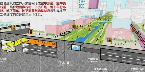 3、立体交通——未来片区多层次、多维度的立体绿色出行体系。双地铁上盖,市政规划的空中连廊系统,“0”距离接驳全城。