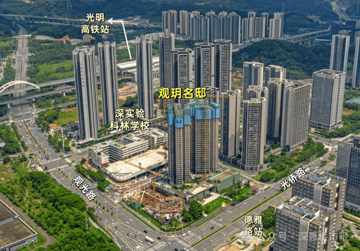 项目交通便利性突出,实现"三轨三高速"立体交通网络。距离在建的13号线德雅路站仅100米(预计2026年中开通),7站直达南山科技园等核心区域;1站可达光明城站,换乘6号线支线二期(2025年年内开通)及广深港高铁、赣深高铁,30分钟直达香港西九龙、广州等城市。