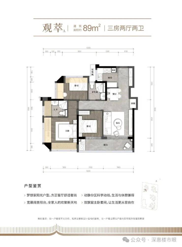 89㎡的3房2厅2卫,1栋02.03户型,设计的是经典竖厅格局,客厅3.4米开间,LDKB一体化,S墙设计预留冰箱卡槽位,动静分区,分别做到了主卧16.28㎡/次卧9.53㎡/次卧9.42㎡(包含墙体飘窗),U型厨房,卫生间干湿分离,得房率约79.1%(不含赠送),客厅连接次卧出9.45m²观景大阳台,西南朝向。套内面积70.43m²+赠送面积14.58m²=实用面积85.01m²,加上赠送面积后得房率96.1%。