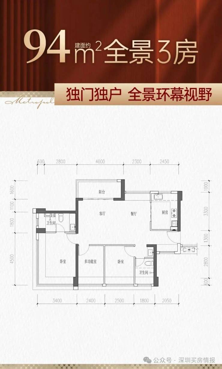 94㎡的3房2厅2卫,设计的是横厅南北通透格局,客餐厅6.3米开间,LDKB一体化,四开间朝南,卧室全南向,3个卧室分别做到了主卧15.3㎡/次卧8.5㎡/次卧8.16㎡(包含墙体飘窗),L型厨房,公卫三段式分离,得房率约77%(不含赠送),阳台主朝东北向。