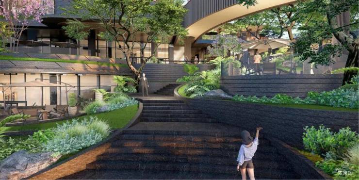 约2.25万㎡游园式生态商街,连通地铁25号线,连廊连接露天茶座、水景庭院
