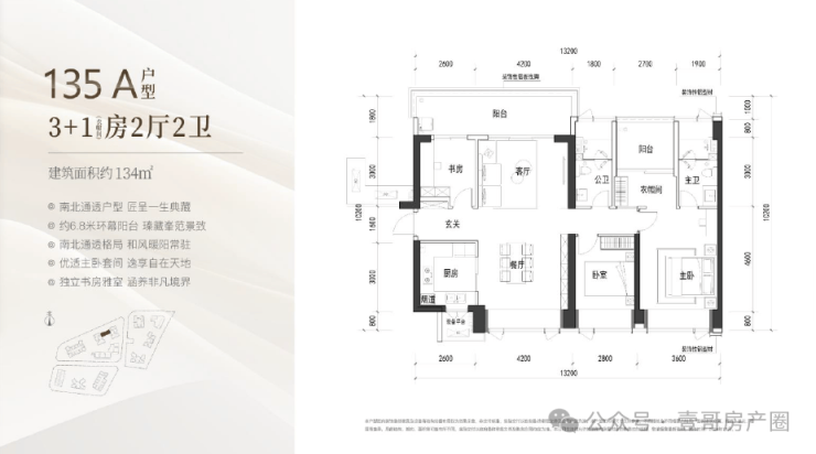 经典的双龙抱珠布局,主人空间与客卧空间互不干扰,具备私密性优势。并且户型方正,实用三房两厅两卫。朝南向四开间面宽共约 13.2m,全明空间,采光极佳。这个户型含赠送半阳台和飘窗的面积后使用率可达约 83%,这在超高层中是比较高的使用率。