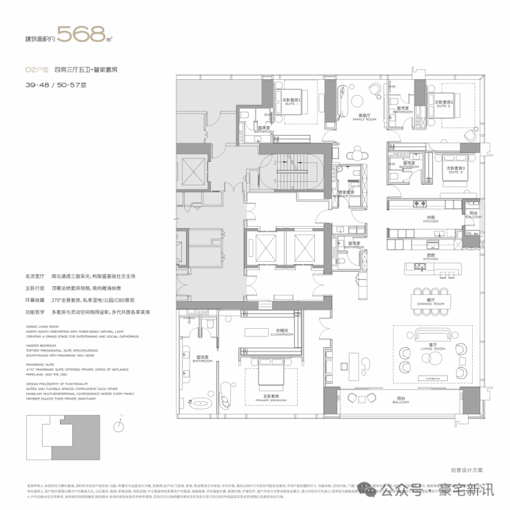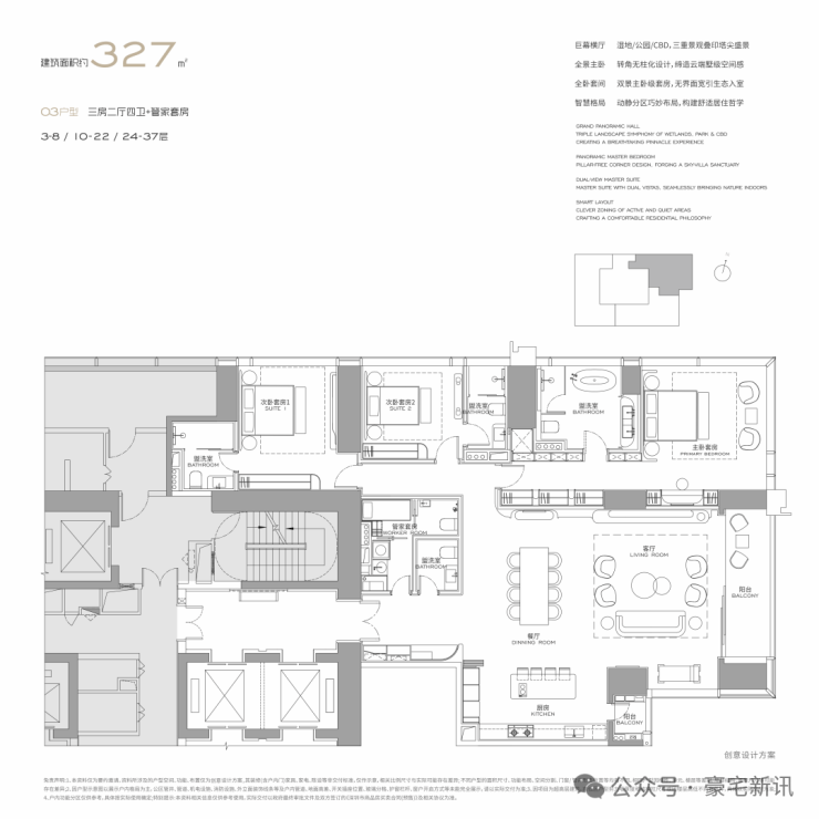 公寓主力户型为303㎡、326㎡、404㎡、572㎡等大平层,最大户型达1000㎡