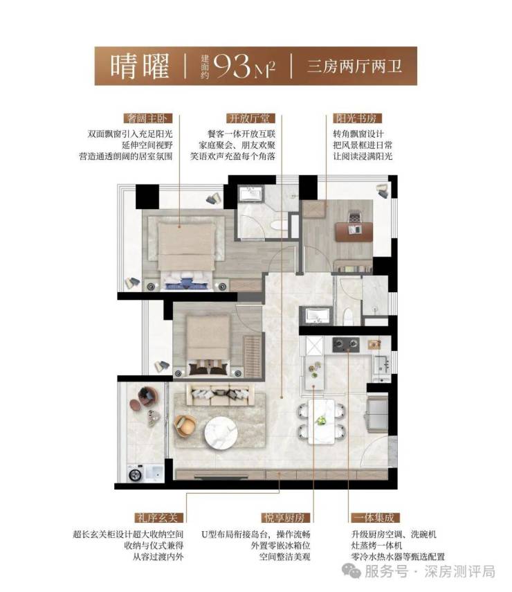 93㎡3房2卫(晴曜):经典竖厅设计,客厅面宽达5.7米,LDK一体化方厅,动静分区,三开间朝南,玄关超长超大收纳空间,主卧次卧带270°转角飘窗,双飘窗设计引入充足阳光,U型厨房,操作动线流畅,提升烹饪效率,公卫独立洗手台,干湿分离设计,二栋一单元/二单元05户型朝西南向,二栋三单元02户型朝东南向。