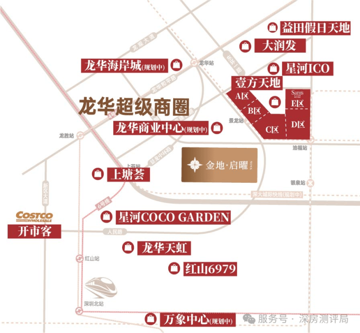 金地启曜府位于龙华超级商圈核心,是龙华商业中心旧改大区的组成部分。该旧改最早可追溯到2004年,规划总建面约162万㎡,旨在打造集住宅、商业、办公于一体的大型综合体。虽然周边目前仍处于大规模建设阶段,城市界面一般,但其紧邻已成熟的壹方天地,地段价值在龙华属于第一梯队,未来将依托五条地铁线路的规划,进一步强化其在湾区通勤中的枢纽地位。