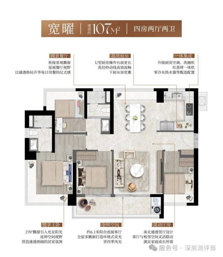 107㎡4房2卫(宽曜):经典竖厅设计南北通透,LDK一体化方厅,阳台长约6.1米连接客卧,动静分区,四开间朝南,主卧次卧带270°转角飘窗,双飘窗设计引入充足阳光,U型厨房,操作动线流畅,出来就是餐厅,动线高效流畅,公卫独立洗手台,干湿分离设计,二栋三单元05户型朝西南向。