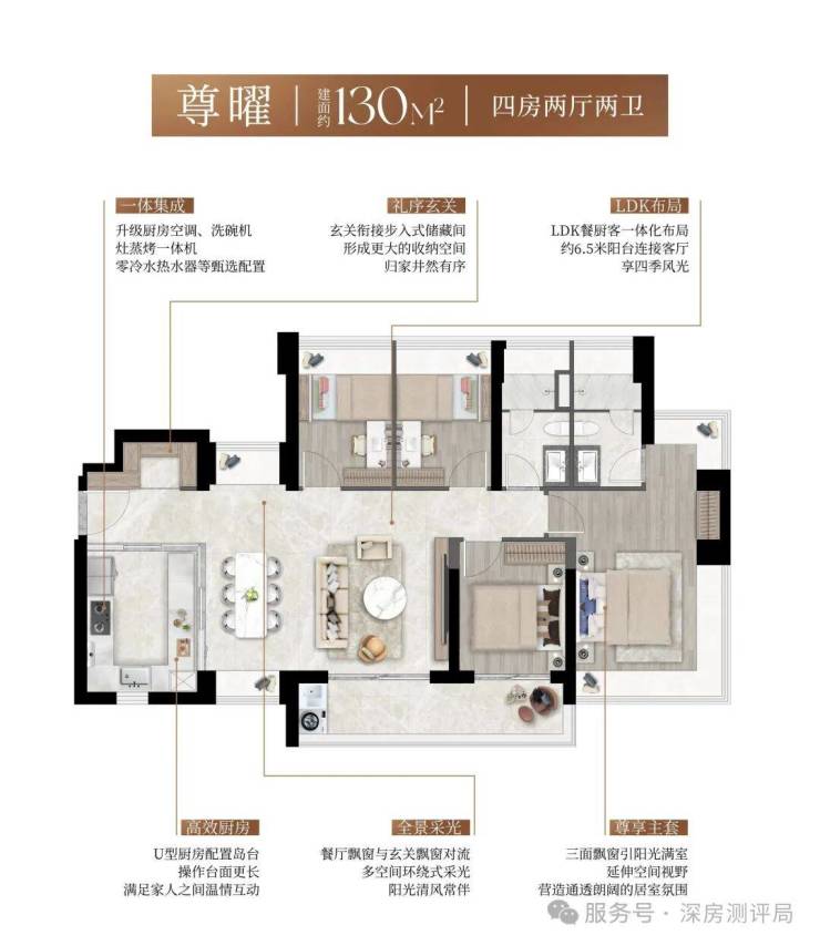 130㎡-4房2厅2卫,折后总价598-668万/套,单价4.5-5.14万/㎡。