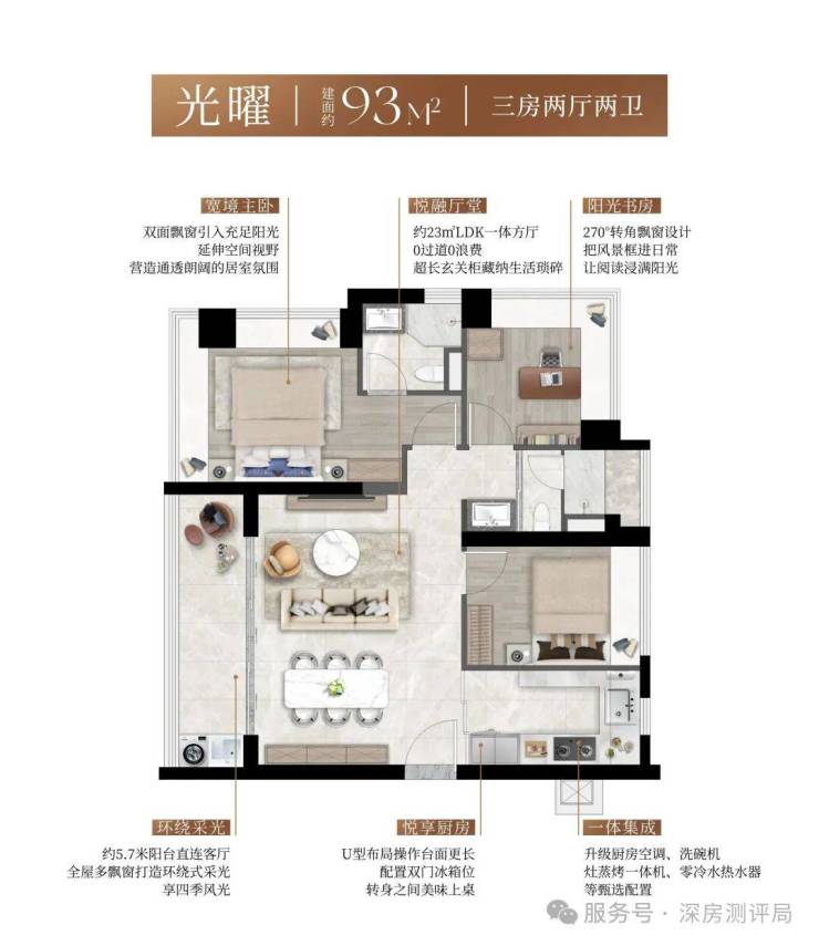 93㎡3房2卫(光曜):横厅设计,客厅面宽达5.7米,LDK一体化方厅约23㎡,0过道浪费,主卧次卧带270°转角飘窗,双飘窗设计引入充足阳光,U型厨房,操作动线流畅,提升烹饪效率,公卫独立洗手台,干湿分离设计,二栋一单元/二单元01户型朝西南向,二栋三单元01户型朝东南向。