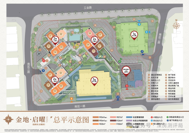 总平面图:显示3栋商品住宅、1栋公租房、1栋办公楼及幼儿园的楼栋布局。项目呈围合式或点阵式布局,全南向设计,确保采光 。