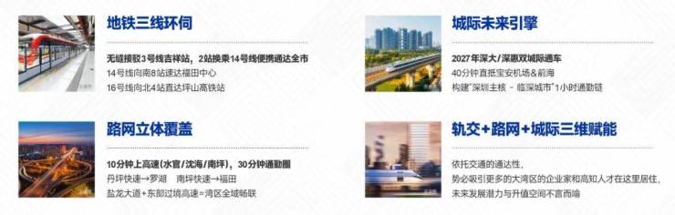 方洲无缝接驳地铁3号线吉祥站,两站换乘14号与16号线大运站,一部短剧的时间直达岗厦北。10分钟上水官高速、沈海高速,15分钟上外环高速,30分钟即达市内。