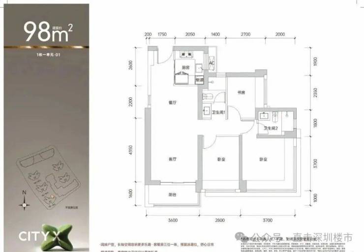 98㎡的3房2厅2卫,1栋1单元01户型,设计的是经典竖厅格局,进门入户玄关,客厅3.6米开间,LDKB一体化设计,动静分区,3个卧室分别做到了主卧14.3㎡/次卧10.36㎡/次卧6.75㎡(包含墙体飘窗),U型厨房,公卫三段式分离,得房率约75.4%(不含赠送),东北朝向。套内面积73.89㎡+赠送面积10.05㎡=实得83.94㎡,加上赠送后得房率约85.65%。还未推售