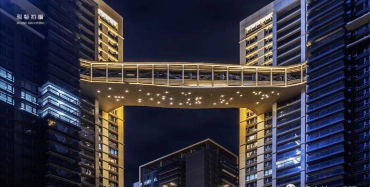 云玺锦庭是一座精心设计得恰到好处的建筑,空中廊桥、顶部的空中庭院,将原本独立的两栋建筑在高空连接起来,形成无障碍观景平台,是居民观看日落、欣赏城市夜景的绝佳去处。空中云厅采用满足适应活动的低照度,用一系列漫射、低矮的点光源进行装饰。连廊下层采用不锈钢进行装饰,利用精细工艺打磨出不同程度的哑光,从而映射出 “月下星光” 的光影意境。