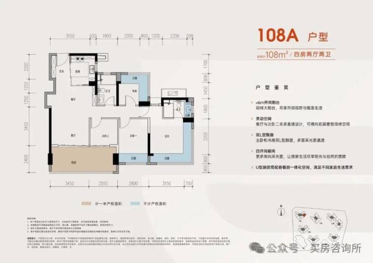 以108㎡户型来看,灵活可变的设计,轻松实现房间与客厅空间打通变成更为阔绰的大横厅。!