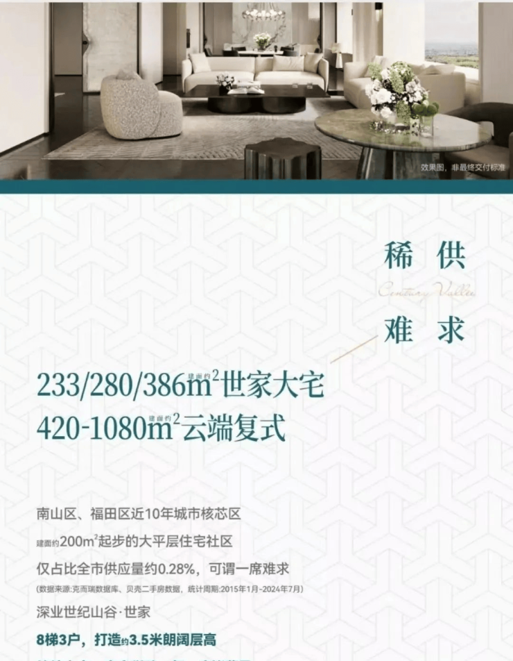 深业世纪山谷顶奢大平层住宅,豪无人性的梯户比,8梯三户,233㎡-386㎡世家大宅、420-1080㎡云端复式,拥有头排高尔夫景观、深圳湾、塘朗山景观,是区域内稀缺的景观大平层住宅产品,值得高净值人群的青睐与关注。