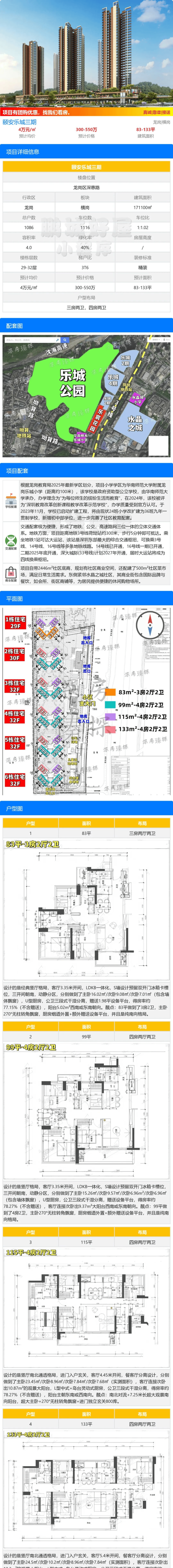 龙岗区大运板块【颐安乐城三期】(备案名:乐宸花园)计划2025年9月底取证入市,本次将首推1-3栋住宅,共528套房源,面积有83m²的3房2卫,99-115-132m²的4房2卫户型,其中83平的3房户型仅有112套,99平的4房是主力户型。