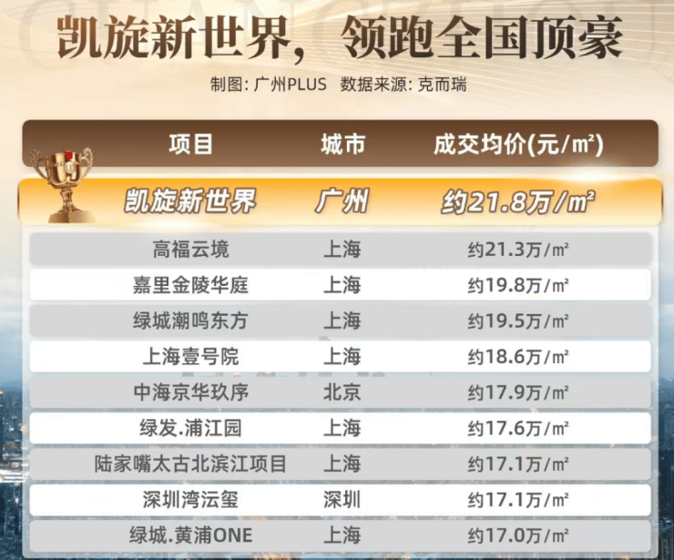 聚焦住宅看,凯旋新世界共有3期产品,分别为枫丹丽舍、广粤尊府、广粤观邸。其中广粤尊府2010年推出,荣获“2024年十大TOP保值力项目”殊荣;广粤观邸2024年底推出,一举拿下2025年新房网签均价全国第一。(数据源自克尔瑞)