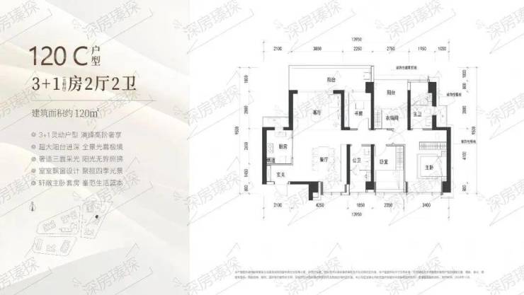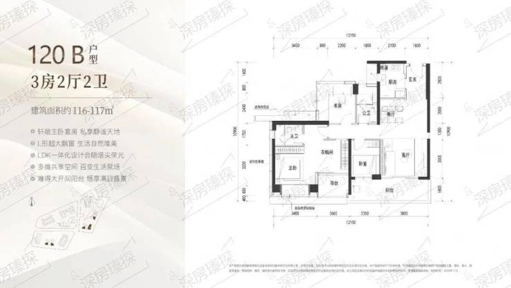 117㎡的3房2厅2卫,B户型(2栋4单元01.02.05/3栋2单元02/05户型),设计的是经典竖厅格局,客厅3.8米开间,LDKB一体化设计,3个卧室分别做到了主卧28.6㎡/次卧9.6㎡/次卧7.05㎡(包含墙体飘窗),客厅连接次卧出6.15米长的宽景大阳台,U型厨房,卫生间干湿分离,得房率约90%(包含赠送),东南或正东朝向。其实也可以改4房。120㎡的4房2厅2卫,C户型(2栋3单元01户型),设计的是竖厅格局,客厅3.85米开间,LDKB一体化设计,动静分区,4个卧室分别做到了主卧16.65㎡/次卧9.9㎡/次卧9.16㎡/次卧6.3㎡(包含墙体飘窗),客厅连接次卧出6.1米长的宽景大阳台,U型厨房,卫生间干湿分离,得房率约90%(包含赠送),西北朝向。117㎡的4房2厅2卫,D户型(3栋2单元06户型),设计的是横厅南北通透格局,客餐厅6.6米开间,四开间朝南,4个卧室分别做到了主卧17.35㎡/次卧9.8㎡/次卧9.1㎡/次卧8.05㎡(包含墙体飘窗),客餐厅出6.6米长的宽景大阳台,U型厨房,公卫三段式分离,得房率约90%(包含赠送),西南朝向。