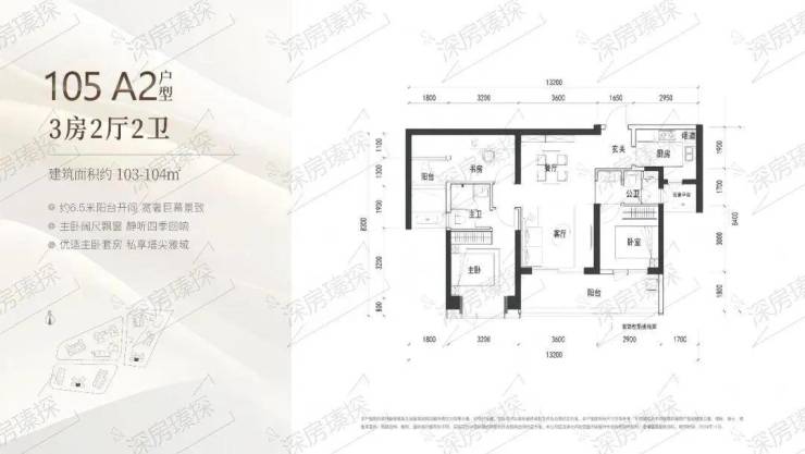104㎡的3房2厅2卫,A1户型(2栋3单元03户型),设计的是竖厅类双龙抱珠格局,客厅3.6米开间,客餐厅一体化设计,3个卧室分别做到了主卧12.8㎡/次卧12㎡/次卧8.7㎡(包含墙体飘窗),客厅连接次卧出6.5米长的宽景大阳台,U型厨房,公卫三段式分离,得房率约90%(包含赠送),东南朝向。