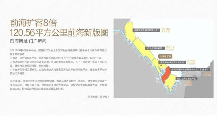 自2021年9月6号,中共中央、国务院正式官宣前海深港合作区扩容,总面积由14.92平方公里扩展至120.56平方公里,纳蛇口、宝安国际机场及大空港区于前海深港合作区