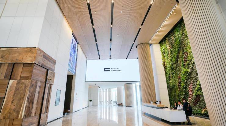 11.5米挑高大堂,70种植物覆盖垂直绿化,配置埃利亚松艺术作品,会呼吸的商务体验。