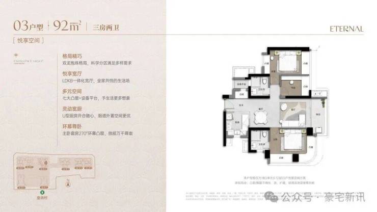 建面约92㎡三房悦奢臻品