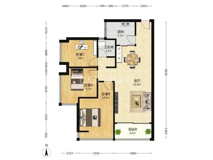 小区:鸿荣源尚璟公馆·78㎡·南3房2卫;