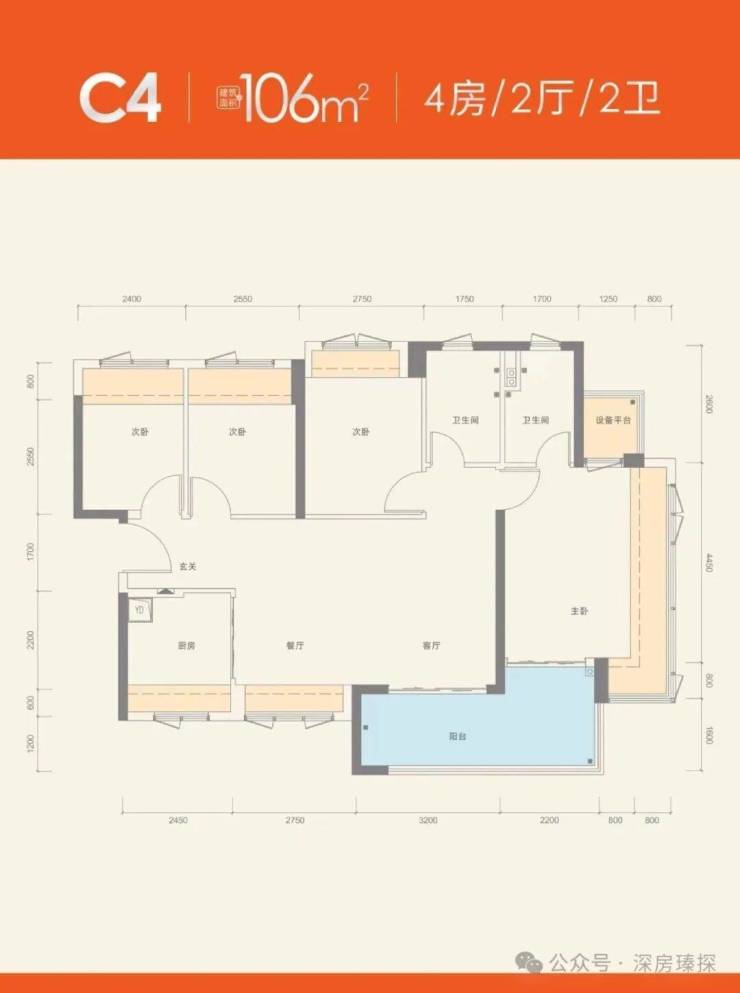 106㎡的4房2厅2卫,设计的是横厅南北通透格局,LDKB一体化设计,客餐厅5.95米开间,四开间朝南,分别做到了主卧18.38㎡/次卧9.76㎡/次卧8.54㎡/次卧8.04㎡(包含墙体飘窗),主卧南北通还带1个设备平台,得房率约104%(包含赠送),U型厨房,卫生间干湿分离,主卧连接客厅出5.5米长的L型超大阳台,西南或东南朝向。