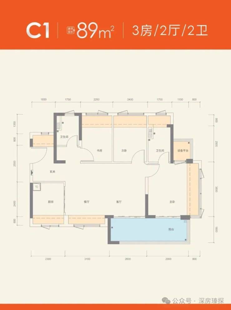 89㎡的3房2厅2卫,设计的是横厅南北通透格局,进门入户玄关,客餐厅5.7米开间,LDKB一体化,四开间朝南,分别做到了主卧11.42㎡/次卧7.31㎡/次卧6.93㎡(实测面积,去掉墙体),主卧南北通还带1个设备平台,主卧连接客厅出5.5米长的超大阳台,U型厨房,卫生间三段式分离,赠送面积高达20.09㎡,实际得房率约104%(包含赠送),西南/东南朝向。