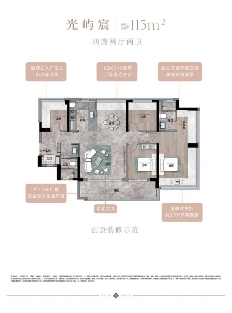 115㎡的4房2厅2卫,设计的是竖厅南北通透格局,进门入户玄关,客厅4.45米开间,餐客厅分离设计,分别做到了主卧23.45㎡/次卧8.96㎡/次卧7.84㎡/次卧7.68㎡(实测面积),客厅连接次卧出10.87m²的观景大阳台,L型中式+岛台灵动式厨房,公卫三段式干湿分离,得房率约78.27%(不含赠送),阳台主朝东南或西南向。靓点:南北对流+7.25米长超大观景南向阳台,超大主卧+270°无柱转角飘窗+进门独立玄关800库。
