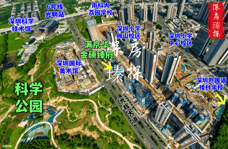 满京华金硕臻府,位于深圳光明区光明科学城“一心两区”的核心区域,紧邻占地208万平方米的科学公园,属于光明规划中“最宜居、居住板块最大”的片区。项目北侧与科学公园仅一街之隔,东、南侧为深圳小学光明学校狮山校区及初中校区,周边市政配套规划密集,如深圳科技馆新馆、国际美术馆等均在建设中,预计2026年前全面落成。
